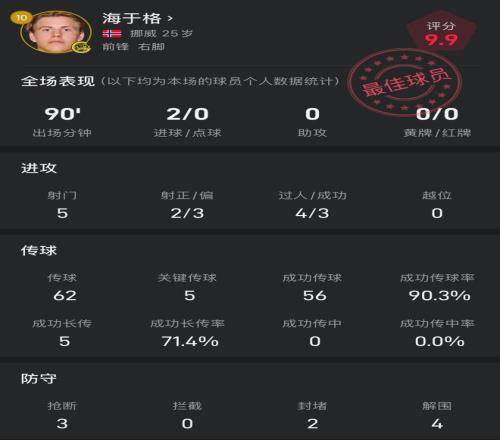 本场比赛,海于格完成梅开二度,是闪耀哥能在主场拿分的最大功臣,赛后他的评分也高达9.9分。