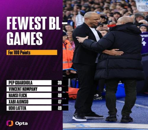 在上一轮联赛带领拜仁击败法兰克福后,孔帕尼执教德甲40场比赛已拿到100分,所用场次仅次于瓜迪奥拉。