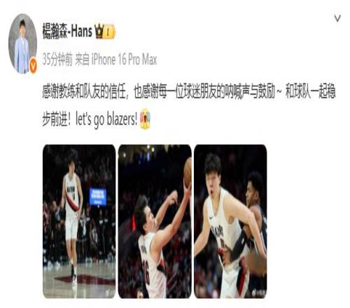 赛后杨瀚森也更新了社媒,内容如下: