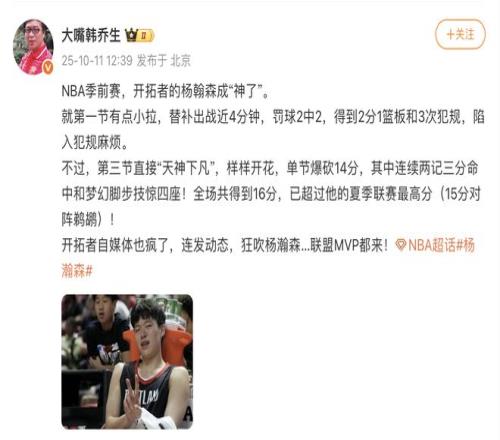 雷速体育10月11报道 今天上午,杨瀚森在开拓者124-123击败国王的NBA季前赛中发挥出色,贡献16分、4个篮板和3次盖帽。著名媒体人韩乔生发文,称赞了杨瀚森的表现。