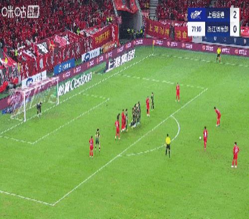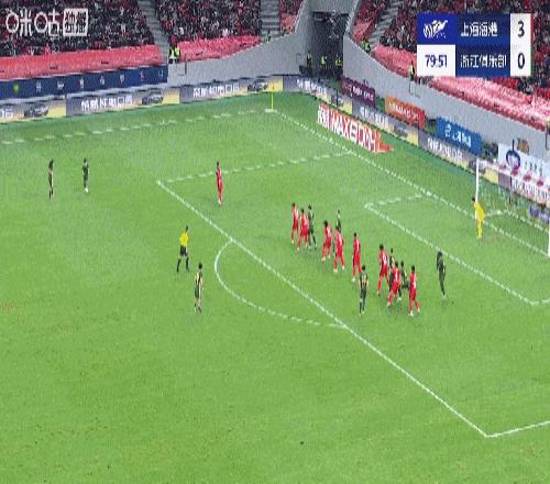 第72分钟,维塔尔主罚禁区前沿任意球,他直接射门皮球绕过人墙飞入球门上角,赵博毫无办法,海港3-0领先浙江。
