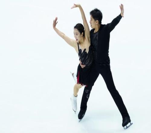 11月7日,中国组合隋文静(左)/韩聪在双人滑短节目比赛中。他们以74.63分的成绩位列第一名。新华社记者 贾浩成 摄