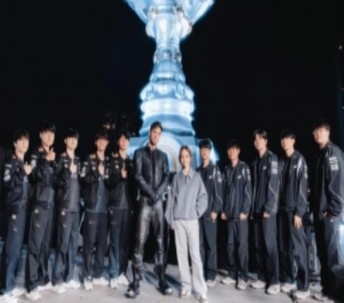 电竞体育11月9报道 LOL官方分享T1、KT十位决赛选手与邓紫棋和Anyma的合照。