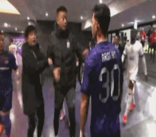 双方球队来到球员通道,意外的一幕:广岛三箭队外援阿尔斯兰居然在台阶等候,当看到高天意走过来,直接上去推搡后者,不过高天意并未与之硬刚。