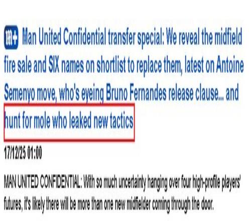 而曼联备战期间一直对球队信息保密,甚至拒绝公布非洲杯国脚的去留结果,就是为了迷惑伯恩茅斯。没想到,却有人泄密。