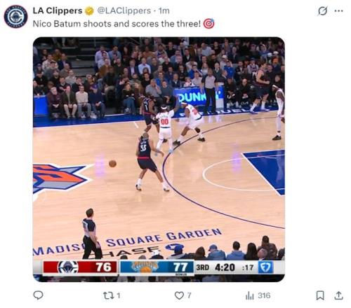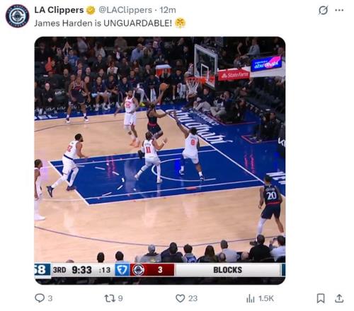 第三节哈登6中2+三分2中1+罚球4中4拿到9分1篮板3助攻1抢断,三节打完21分8助攻3篮板2抢断,而伦纳德第三节只拿到4分,三节打完25分1篮板1助攻,快船已经被尼克斯反超。