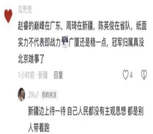当时新疆球迷有点看不起北京的实力,认为他们没什么办法拿下总冠军。赵睿则直接回怼:新疆边上待一待自己人民都没有主观思想都是别人带着跑。这样的话语出来社交网站都炸锅了,因为这明显就是不当言论。